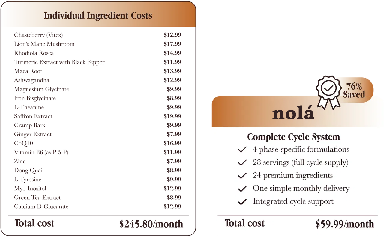 A lot. Most women are already spending $100-200/month on magnesium, iron, adaptogens, mood support, PMS gummies, and greens powders without knowing when to take what.